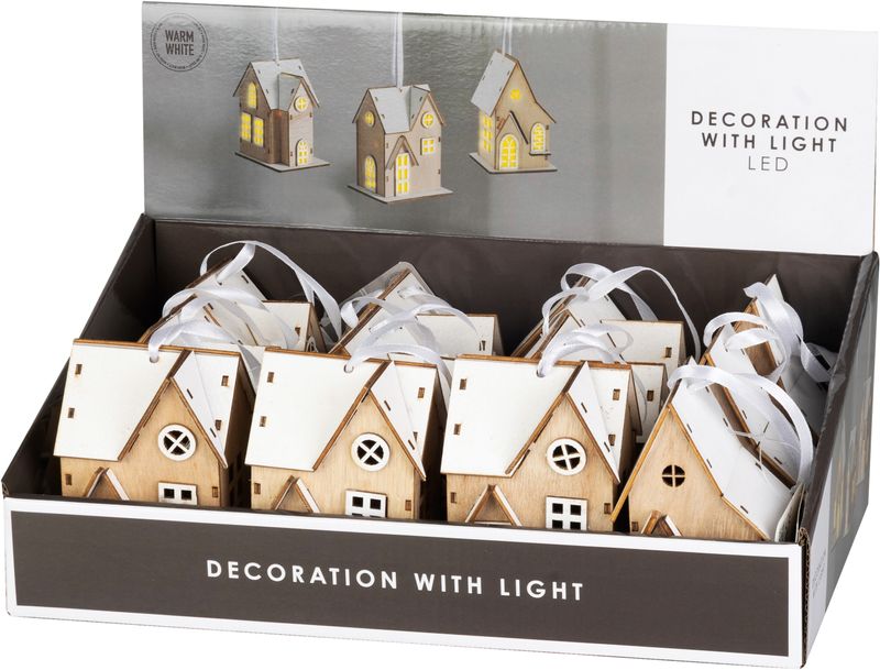Dekorácia Domček, 3xLED, mix vzorov, 1x CR2032, Sellbox 12ks
