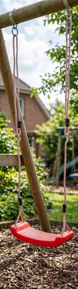 Detská červená plastová hojdačka je praktická, ľahko umiestniteľná takmer kdekoľvek vo vašej záhrade. Hojdačka nemá opierku a nemá ani prednú ochranu pred pádom, preto je potrebné na dieťa dávať pocelý čas pozor. Nosnosť hojdačky je 70 kg a jej rozmery sú 43 x 17 x 8,5 cm. Na oboch stranách sedacej časti sú pripevnené laná dlhé 2 m, s priemerom 10 mm. Je potrebné ich poriadne uviazať na miesto, kde chcete hojdačku mať. Uistite sa, že je pripevnená správne, nie príliš vysoko, a že nehrozí riziko poranenia.