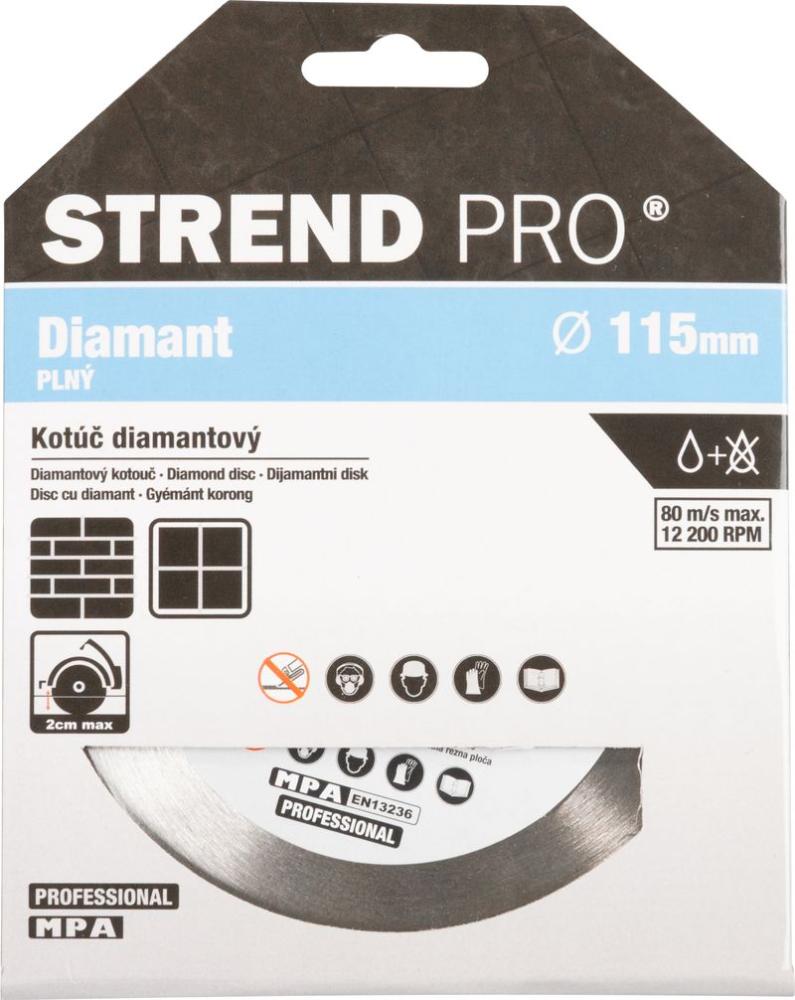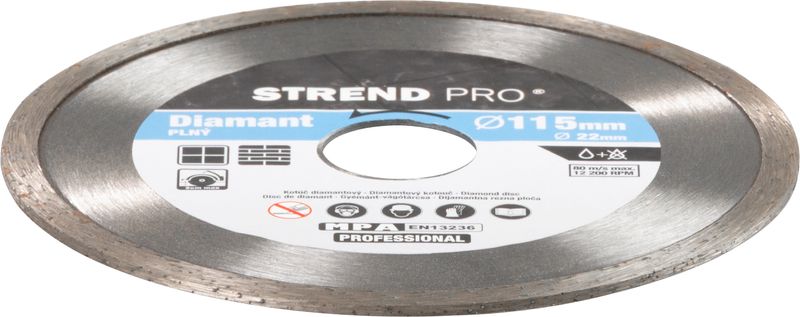 Plný diamantový kotúč Strend Pro je vhodný pre domácich kutilov, ale aj pre profesionálnych remeselníkov. Vhodný je na mokré aj suché opracovávanie. Jeho použitie je rozsiahle - kameň, keramika, strešná krytina, tvárnice, betón, tehly, stavebné materiály, mramor a kameninové rúry. Jeho priemer je 115 mm a maximálne povolené otáčky sú 13200 rpm.