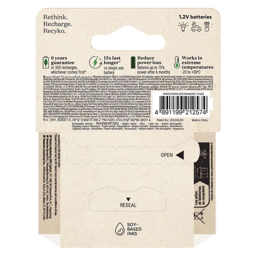 GP sa nezameriava len na výrobu špičkových výrobkov, ale aktívne hľadá spôsoby, ako znížiť vplyv svojich výrobkov a ich obalov na životné prostredie. Ich inovatívny rad dobíjacích batérií a nabíjačiek s názvom Recyko je príkladom tohto úsilia. Tieto výrobky sú balené v papierových obaloch, ktoré neobsahujú plasty. Tým sa podporuje používanie recyklovaných materiálov a znižuje sa množstvo odpadu. Vďaka týmto obalom šetrným k životnému prostrediu sa môžete aj vy podieľať na pozitívnej zmene! Prispejte k zníženiu záťaže životného prostredia.