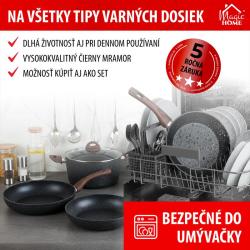 Ak si potrpíte nakvalitnékuchynské riady, táto panvica je pre Vás ako stvorená. Panvica MagicHome Black Marble Line jevyrobená zo zliatiny hliníka s nepriľnavým povrchoma3-vrstvovým mramorovým náterom. Má3 mm indukčné dno, ktoréšetrí energiu. Rukoväť obsahuje drevený náter s ochranou proti plameňu. Panvica jevhodná na všetky typy sporákov: indukcia, elektrika, plyn, sklokeramika a halogén a je tiež vhodná do umývačky riadu. Nevhodná do rúry. Ješetrná k životnému prostrediu, neobsahuje PFOA, PFOS, VOC, PB ani CD. Priemer: 20 cm.