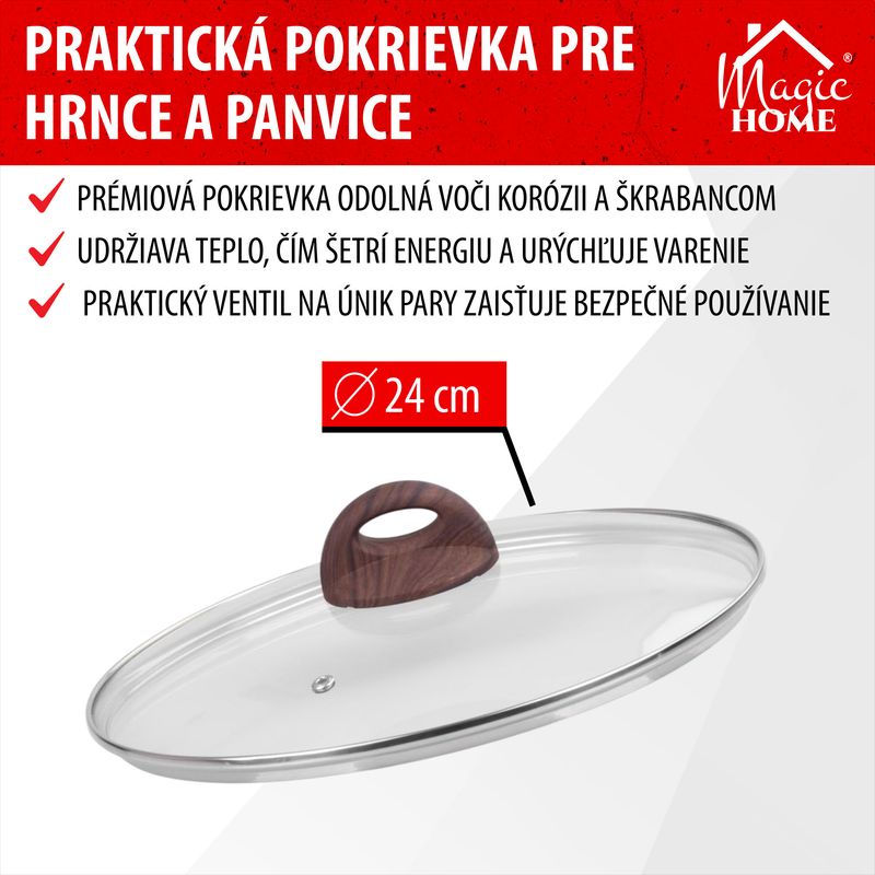 Pokrievka MagicHome Black Marble Line je vhodná na rajnice, hrnce a panvice. Rukoväť s dreveným náterom. Je vhodná do umývačky riadu. Nevhodná do rúry na pečenie. Priemer: 24 cm.