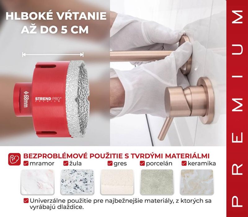 Sada vyrezávačov Strend Pro Premium je vhodná na vyrezávanie všetkých druhov tvrdeného kameňa a jeho zlúčenín, keramických dlaždíc, mramoru, gresu, porcelánu a žuly. Špičkový proces spájania diamantov zabezpečuje vysokú odolnosť voči vysokým teplotám a predlžuje životnosť. Extrémne ľahké rezanie a vysoká výkonnosť pri vykružovaní. Perfektne ju využijete pri montáži kúpeľnovej sanity a príslušenstva, inštalácii káblov, elektrického vedenia, radiátorov atď. Je použiteľná s akoukoľvek vŕtačkou s použitím vhodného adaptéru. Typ upínania: M14, O vyrezávačov je 20, 35, 45, 55 a 68 mm.