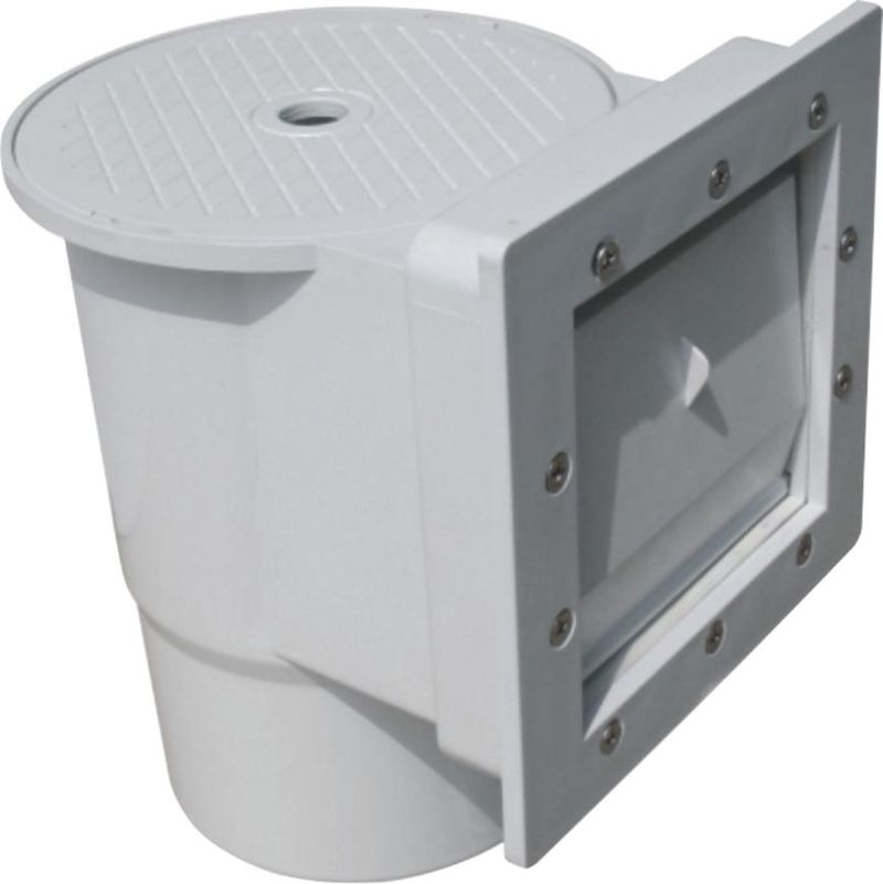 Skimmer je vyrobený z odolného plastu, ktorý je odolný voči UV žiareniu, chlorovanej vode aj mechanickému namáhaniu. Robustná konštrukcia s tuhým telom a prehľadným priezorným okienkom na prednej strane umožňuje jednoduchú kontrolu stavu košíka bez nutnosti demontáže. Horná časť je opatrená pokrievkou s protišmykovým reliéfnym povrchom, ktorá zabraňuje vniknutiu nečistôt zvrchu. Montáž priamo do steny bazéna je jednoduchá vďaka prírube s predvŕtanými otvormi pre skrutky.
