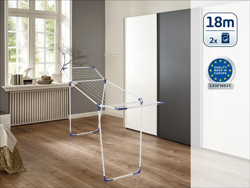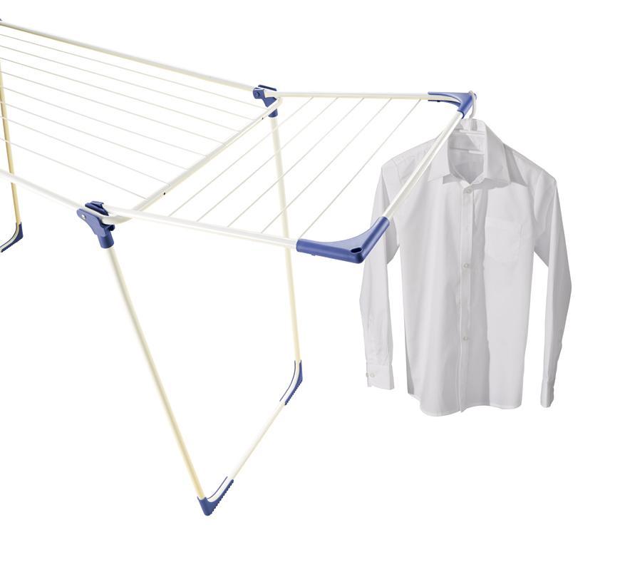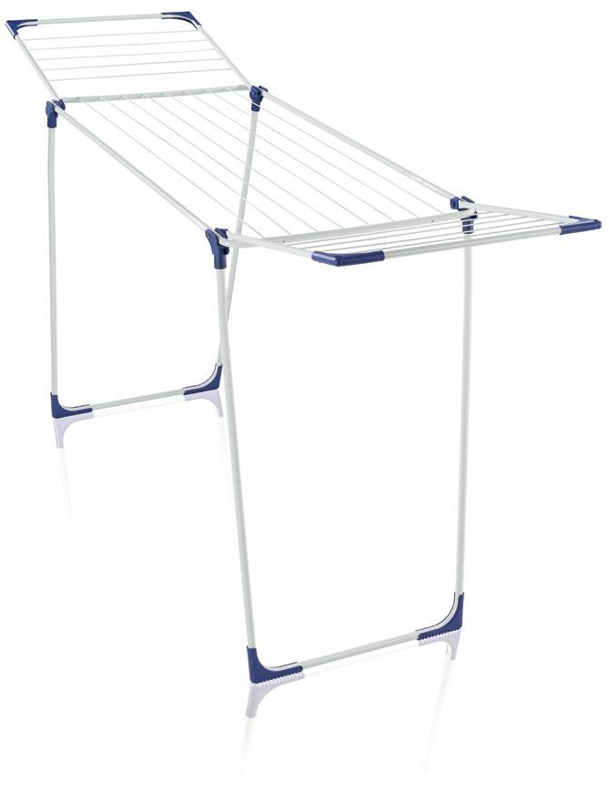 Stabilný sušiak na bielizeň s výklopnými bočnicami, ideálny pre vnútorné i vonkajšie použitie, 18 m sušiacej plochy = až 2 práčky bielizne, výška sklápacích bočníc 100 cm, možnosť zavesenia dlhých kusov odevov, 4 otvory na zavesenie ramienok, záruka 3 roky.