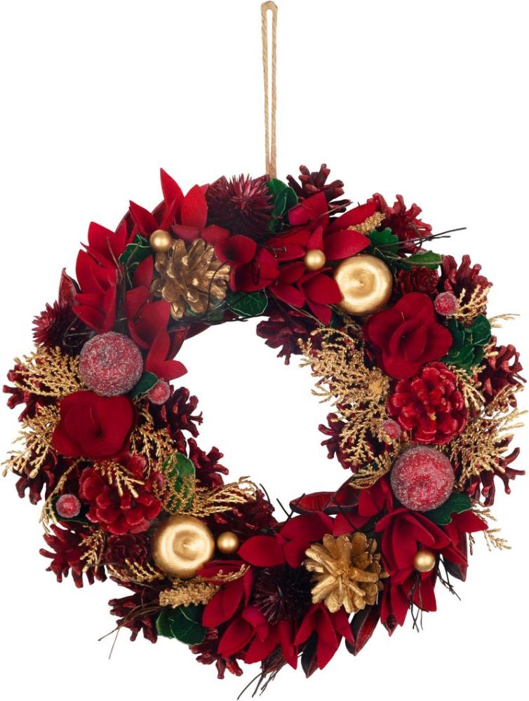 Vianočný veniec MagicHome v červeno-zlatej farebnej kombinácii je krásnou a štýlovou dekoráciou, ktorá vnesie do vášho domova pravú sviatočnú atmosféru. Je ozdobený detailne prepracovanými prvkami – šiškami, guličkami, kvetmi a trblietavými ozdobami v luxusnom červeno-zlatom prevedení.