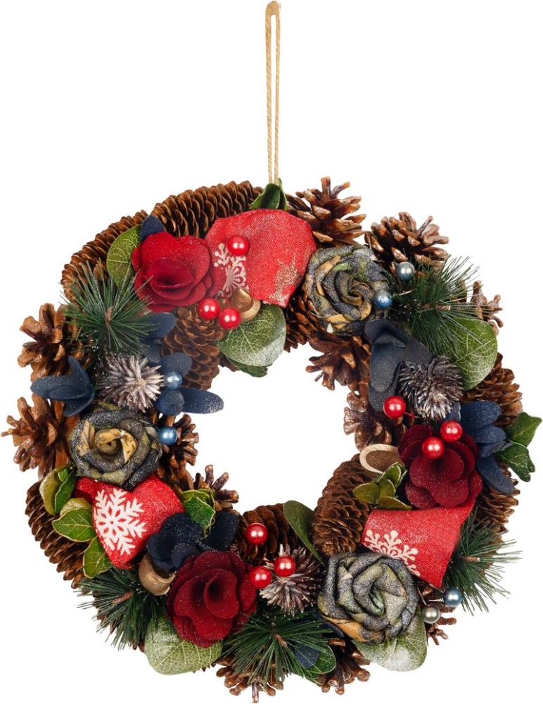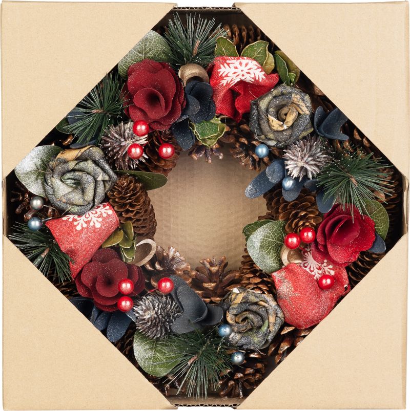 Dizajnový vianočný veniec MagicHome prinesie do vášho domova nádych elegancie a sviatočnej atmosféry. Veniec je zdobený prírodnými šiškami, dekoratívnymi kvetmi a ozdobnými guľôčkami v modro-červených tónoch, ktoré vytvárajú moderný a pritom teplý vzhľad.