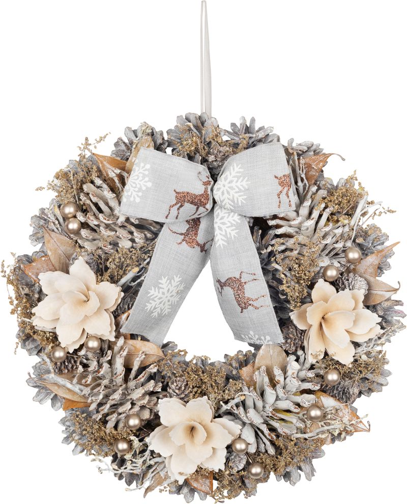 Spojenie prírodných šišiek, ozdobných prvkov a decentnej farebnosti robí z tohto venca ideálny doplnok na dvere, stenu alebo okno. Veniec prinesie do vášho domova útulnú a štýlovú vianočnú atmosféru.