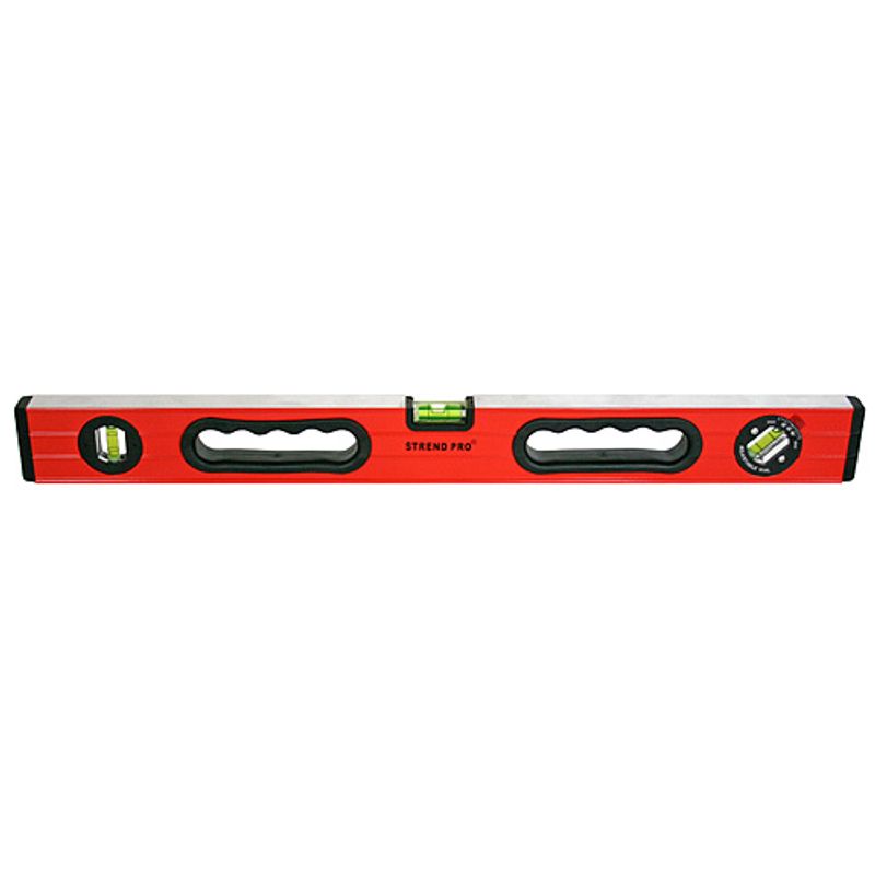 Vodováha FSA-99B má protišmykové gumové hrany, jemné držiaky, vrúbkovanú hornú a dolnú hranu a nastaviteľnú libelu na meranie uhlov.