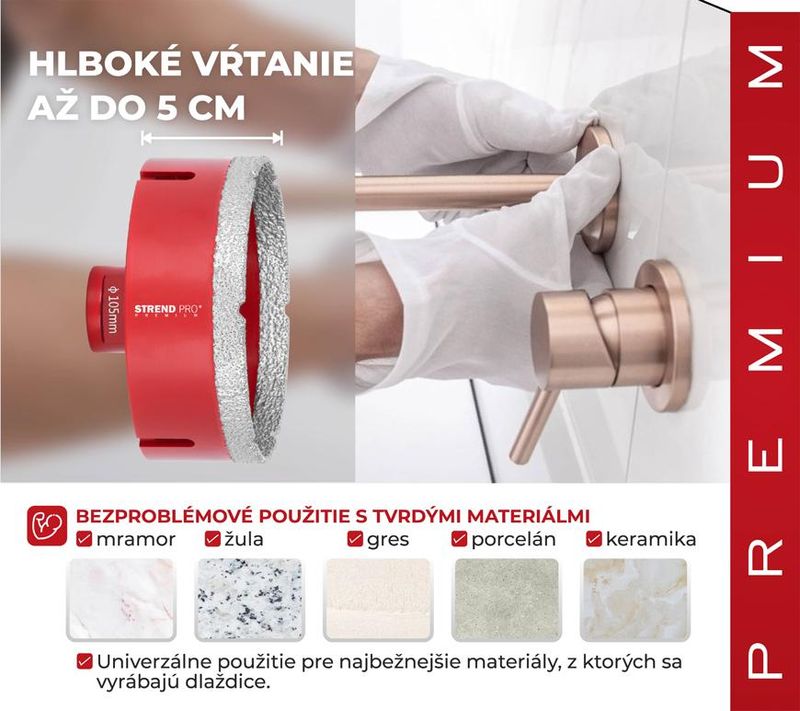 Vyrezávač Strend Pro Premium je vhodný na vyrezávanie všetkých druhov tvrdeného kameňa a jeho zlúčenín, keramických dlaždíc, mramoru, gresu, porcelánu a žuly. Špičkový proces spájania diamantov zabezpečuje vysokú odolnosť voči vysokým teplotám a predlžuje životnosť. Extrémne ľahké rezanie a vysoká výkonnosť pri vykružovaní. Perfektne ho využijete pri montáži kúpeľnovej sanity a príslušenstva, inštalácii káblov, elektrického vedenia, radiátorov atď. Je použiteľný s akoukoľvek vŕtačkou s použitím vhodného adaptéru. Typ upínania: M14, O vyrezávača je 105 mm.