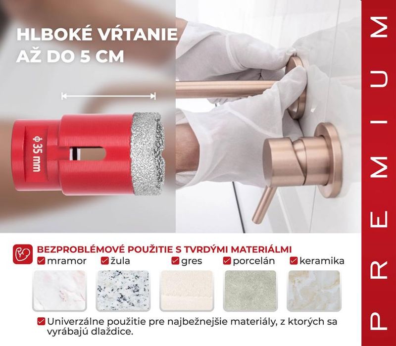 Vyrezávač Strend Pro Premium je vhodný na vyrezávanie všetkých druhov tvrdeného kameňa a jeho zlúčenín, keramických dlaždíc, mramoru, gresu, porcelánu a žuly. Špičkový proces spájania diamantov zabezpečuje vysokú odolnosť voči vysokým teplotám a predlžuje životnosť. Extrémne ľahké rezanie a vysoká výkonnosť pri vykružovaní. Perfektne ho využijete pri montáži kúpeľnovej sanity a príslušenstva, inštalácii káblov, elektrického vedenia, radiátorov atď. Je použiteľný s akoukoľvek vŕtačkou s použitím vhodného adaptéru. Typ upínania: M14, O vyrezávača je 35 mm.