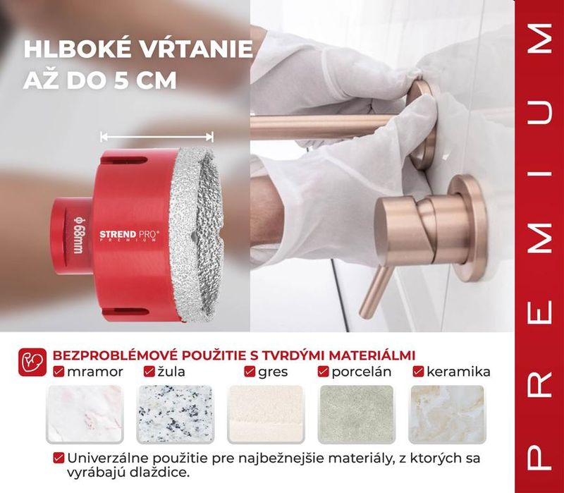 Vyrezávač Strend Pro Premium je vhodný na vyrezávanie všetkých druhov tvrdeného kameňa a jeho zlúčenín, keramických dlaždíc, mramoru, gresu, porcelánu a žuly. Špičkový proces spájania diamantov zabezpečuje vysokú odolnosť voči vysokým teplotám a predlžuje životnosť. Extrémne ľahké rezanie a vysoká výkonnosť pri vykružovaní. Perfektne ho využijete pri montáži kúpeľnovej sanity a príslušenstva, inštalácii káblov, elektrického vedenia, radiátorov atď. Je použiteľný s akoukoľvek vŕtačkou s použitím vhodného adaptéru. Typ upínania: M14, O vyrezávača je 68 mm.
